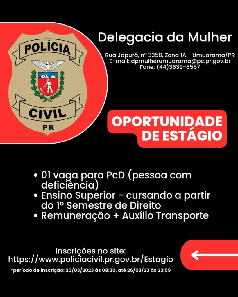 Para Umuarama há uma vaga para PcD na Delegacia da Mulher, para pessoa que esteja cursando a partir do primeiro semestre da graduação em Direito.