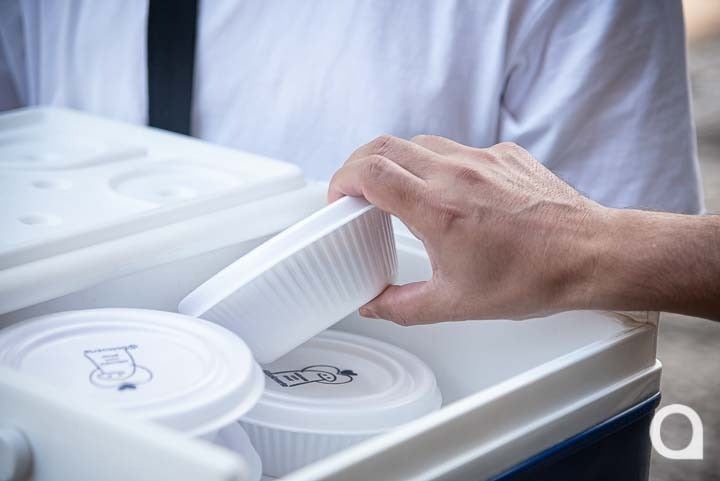 O ‘boloverte’ do Renato é uma receita que mistura, em camadas, bolo, sorvete e fruta [de verdade]. Na conversa com OBemdito ele apresentou duas versões: com morango e com abacaxi. Ele abriu a caixa térmica, uma das suas ferramentas de trabalho, e explicou como é confeccionado.