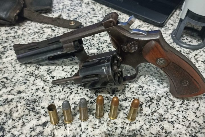 Eles deram voz de abordagem e após uma demora para acatar a ordem, eles puderam verificar que o objeto que estava no banco era um revólver calibre .38 da marca Ilama, que estava municiado.
