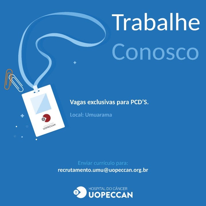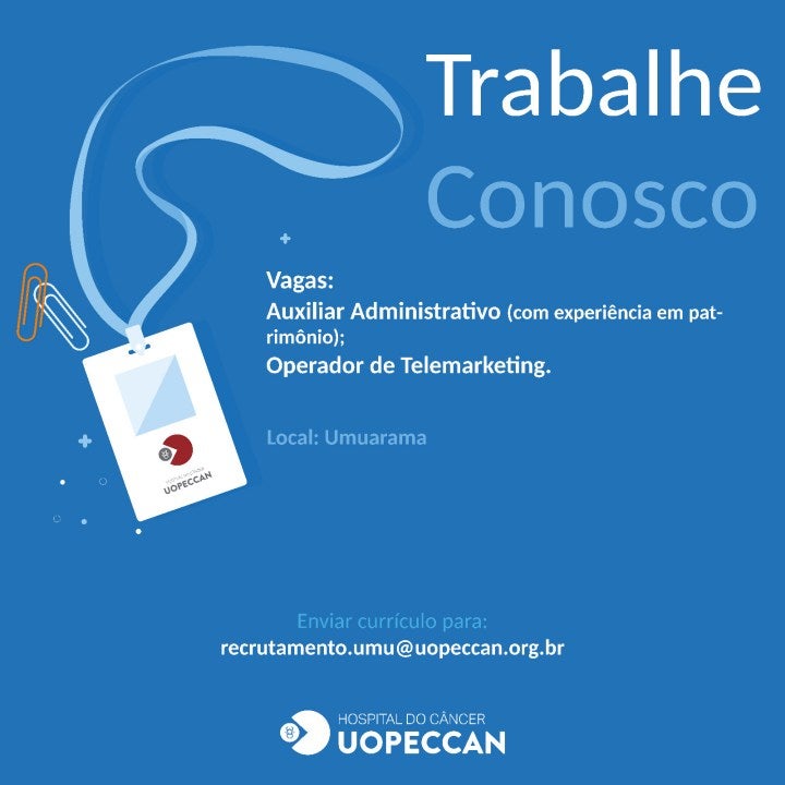 O Hospital Uopeccan de Umuarama também divulgou que está com vagas disponíveis para Auxiliar Administrativo (com experiência em patrimônio) e para Operador de Telemarketing. Também há vagas exclusivas para pessoas com deficiência (PcD’s).