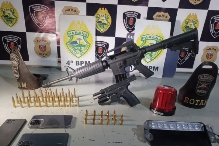 Na garagem da casa, dois homens estavam mexendo em um dos veículos quando foram aborados pelos policiais. Em conversa com as equipes, eles assumiram que em um dos quartos da casa havia munições, uma pistola calibre 9mm e um fuzil semiautomático calibre 5,56 escondido em um guarda-roupa. Também foram apreendidos celulares que estavam na casa.