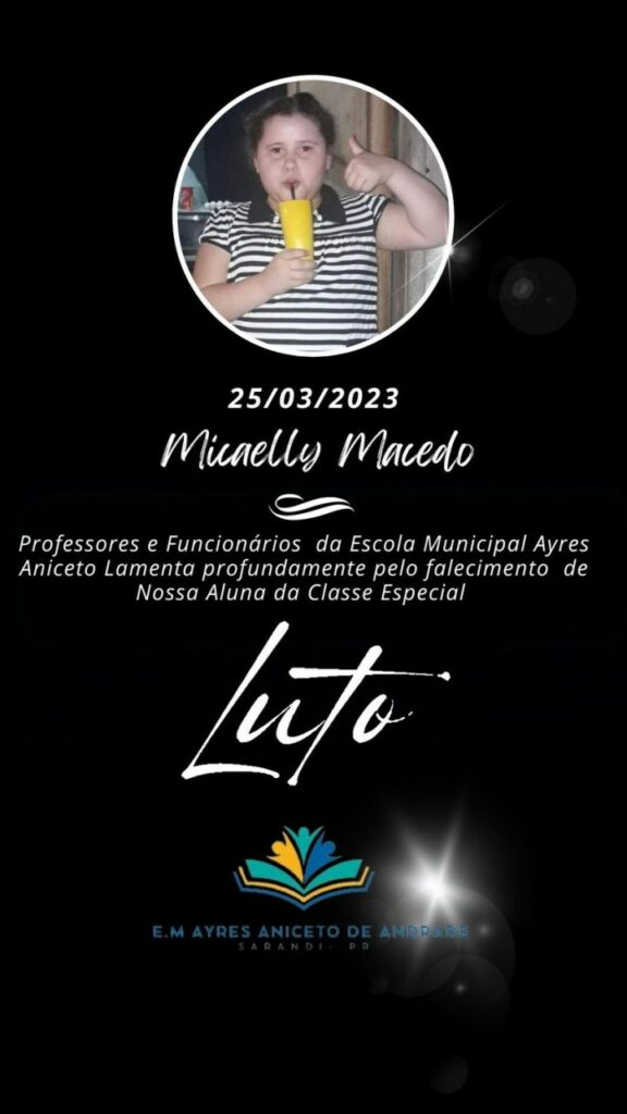 “É com imensa tristeza que comunicamos o falecimento de nossa aluna Micaelly Macedo, Micaelly era aluna da Classe especial desde o ano de 2019. Nossa Micaelly agora virou estrelinha. O velório será a partir das 14 horas na Capela do Vida Prev na avenida Maringá em frente ao colégio Lisboa”.