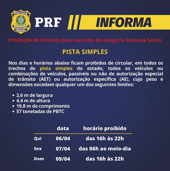 Para o feriado da Semana Santa, a PRF proibirá, em todos os trechos de pista simples do estado, os veículos ou combinações de veículos, passíveis ou não de autorização especial de trânsito (AET) ou autorização específica (AE), cujo peso e dimensões excedam qualquer um dos seguintes limites: