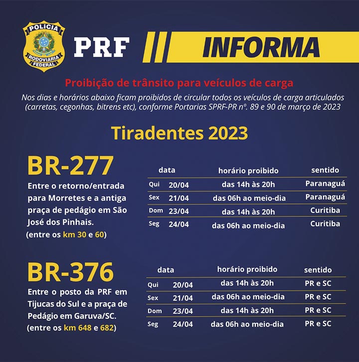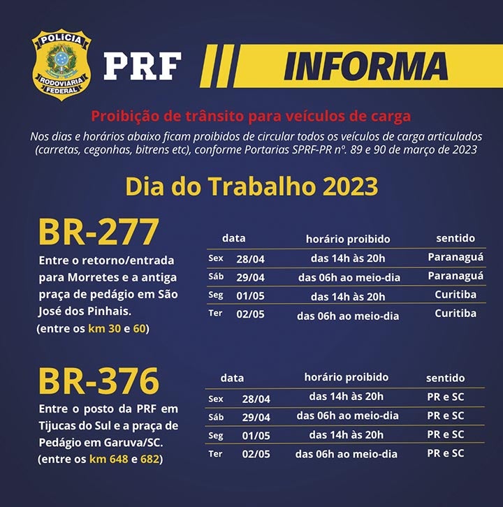 Com a proximidade dos feriados da Semana Santa, Tiradentes, Dia do Trabalho e Corpus Christi e a continuidade das obras nas BRs 376 e 277, com a consequente formação de longas filas pela indisponibilidade da capacidade total de tráfego das rodovias, a Polícia Rodoviária Federal (PRF) vai estender a restrição de circulação de veículos pesados em algumas rodovias.
