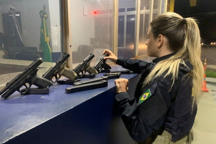 Mulher que viajava com filho de 5 meses é presa com quatro pistolas equipadas com ‘kit rajada’