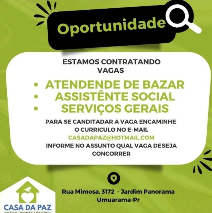 A Casa da Paz de Umuarama também divulgou em suas redes sociais que está com vagas de emprego disponíveis para os cargos de Atendente de Bazar, Assistente Social e Serviços Gerais.