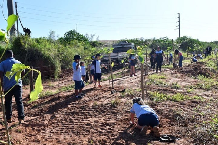 A visita, no último dia 23, resultou em uma ação prática nesta semana. Na terça-feira (28) cerca de 50 alunos do estabelecimento de ensino participaram do projeto de reflorestamento de uma área no Parque Primeiro de Maio, próximo à Escola Municipal Evangélica. Em dois períodos, às 9h e depois às 15h, as crianças auxiliaram no plantio de 100 mudas de ipês em um fundo de vale do município que está sendo recuperado.