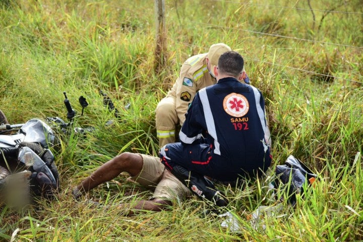 A criança que estava na garupa foi levada até uma residência próxima por populares que testemunharam o acidente. O Corpo de Bombeiros está se deslocando até esse endereço para verificar se ela se feriu durante o episódio.