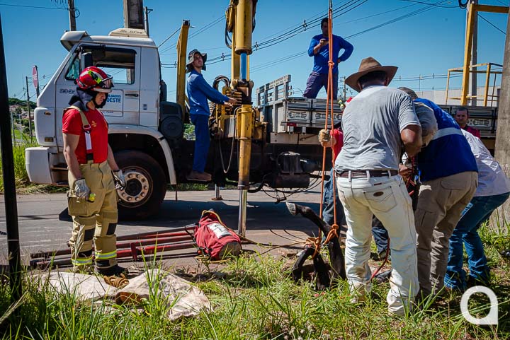 Equipes do Corpo de Bombeiros de Umuarama resgataram na manhã desta sexta-feira (31), um cavalo que havia caído em um bueiro aberto, na entrada da Estrada Jaborandi.