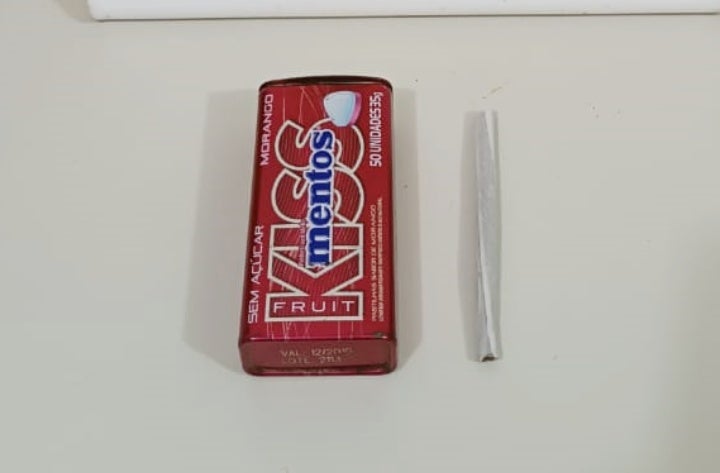 No entanto, ao ser verificado o local apontado pelo cão, os PMs constataram que a passageira transportava dentro de uma embalagem de balas um cigarro de maconha (conhecido como baseado), que pesou aproximadamente um grama.