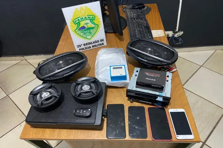 No carro os policiais encontraram quatro alto falantes, uma caixa amplificadora, um aparelho de DVD, uma máquina de cartão de crédito e uma câmera de ré. Os presos foram encaminhados para à Delegacia. O veículo foi aprendido.