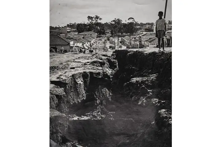É inacreditável hoje ver a imagem dessa profunda cratera e saber que ela, na década de 1960, foi provocada pelas chuvas em plena Avenida Paraná, a principal via pública de Umuarama, uma das cidades mais importantes do Paraná na atualidade... E, pior, é amargo saber que a erosão ainda existe na Capital da Amizade - Fotos: Acervo pessoal