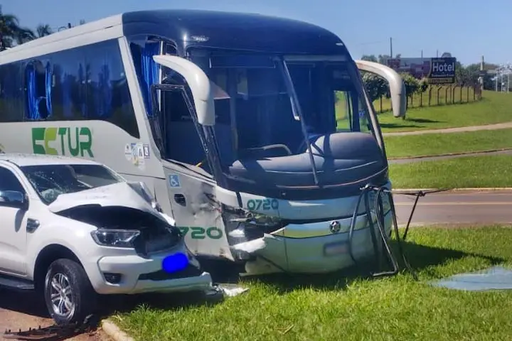 O ônibus de uma empresa de Cafelândia colidiu contra uma Ford Ranger no início da tarde. O coletivo seguia para o Frigorífico Copacol.