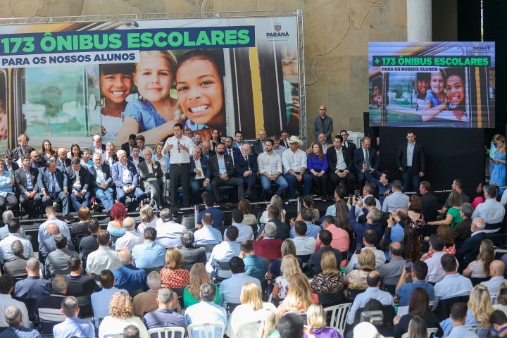O governador Carlos Massa Ratinho Junior entregou nesta segunda-feira (03) mais 173 ônibus escolares do programa Caminho da Escola. Os veículos foram adquiridos por aproximadamente R$ 58,5 milhões, com recursos do Governo do Estado e de emendas parlamentares através do Fundo Nacional de Desenvolvimento Educacional (FNDE).