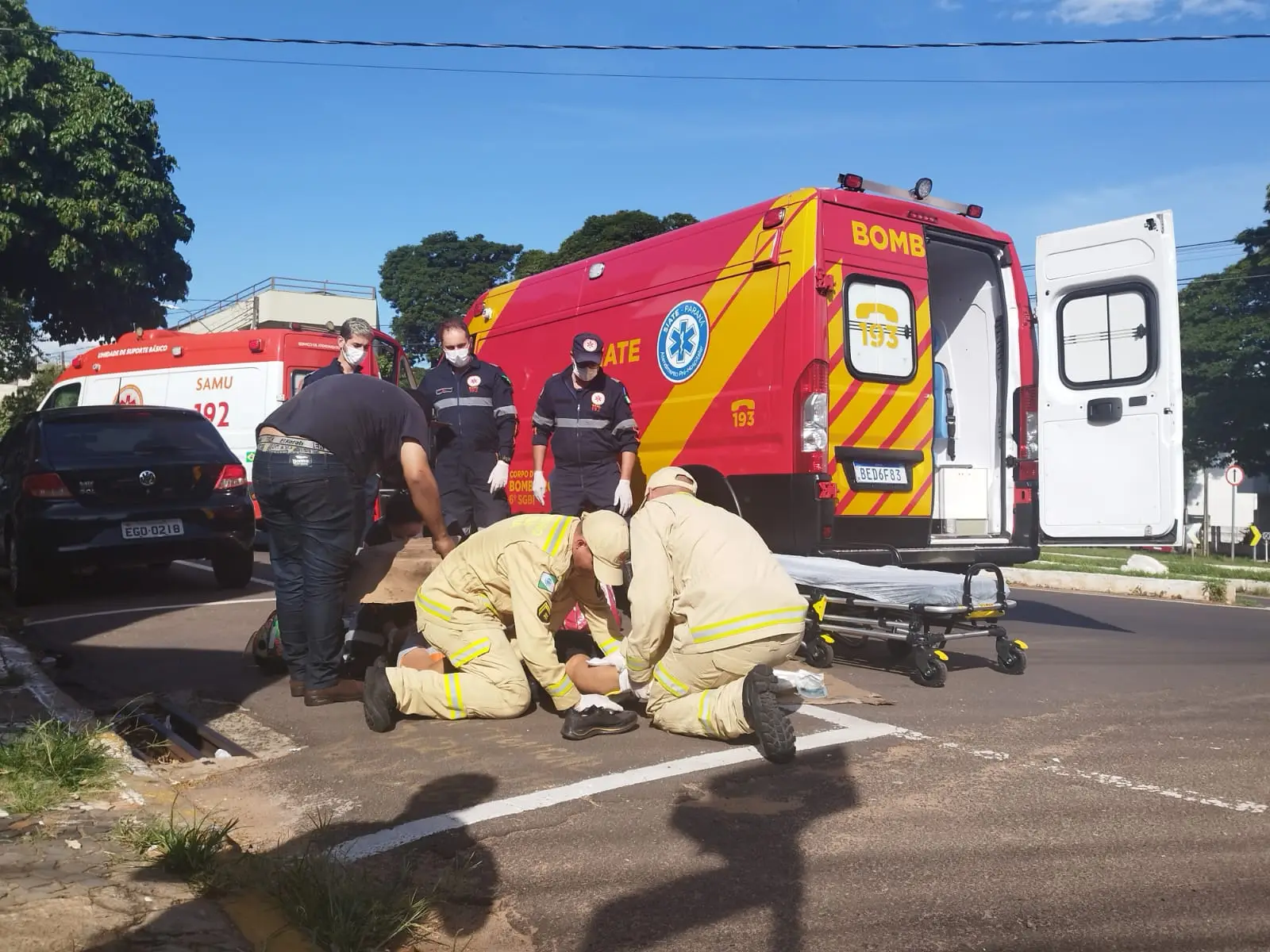 A mulher que estava na garupa da moto machucou os joelhos e pés na queda. Ela foi atendida pelas equipes do Corpo de Bombeiros e do Samu. A vítima foi encaminhada para a Norospar.