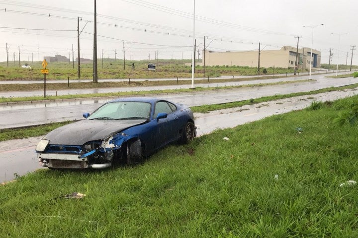 Um automóvel Toyota Supra foi parar em cima da ciclovia da avenida Portugal, de Umuarama, após um acidente próximo ao trevo para Maria Helena, na tarde desta quinta-feira (6). De acordo com as informações, o veículo teria aquaplanado na pista molhada pelas chuvas de hoje.