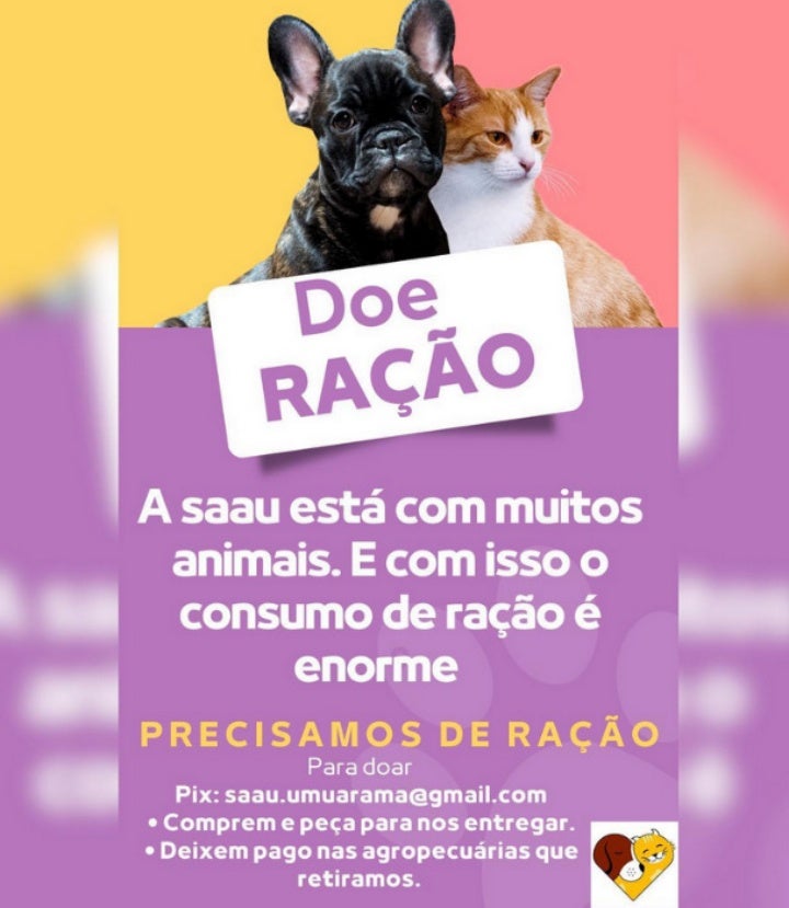 Além da ração, a Saau também aceita doações de medicamentos e itens de higiene. Doações de dinheiro também podem ser feitas pelo Pix (chave: saau.umuarama@gmail.com). Confira abaixo outras formas de doar: