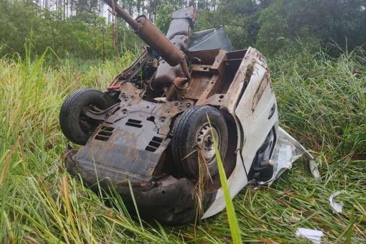 Com o impacto o furgão foi repartido em dois e foi parar às margens da rodovia. A parte dianteira da caminhonete também foi completamente destruída.