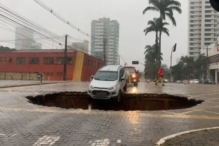 Cratera se abre no centro de Maringá e carro fica por um triz de ser ‘engolido’