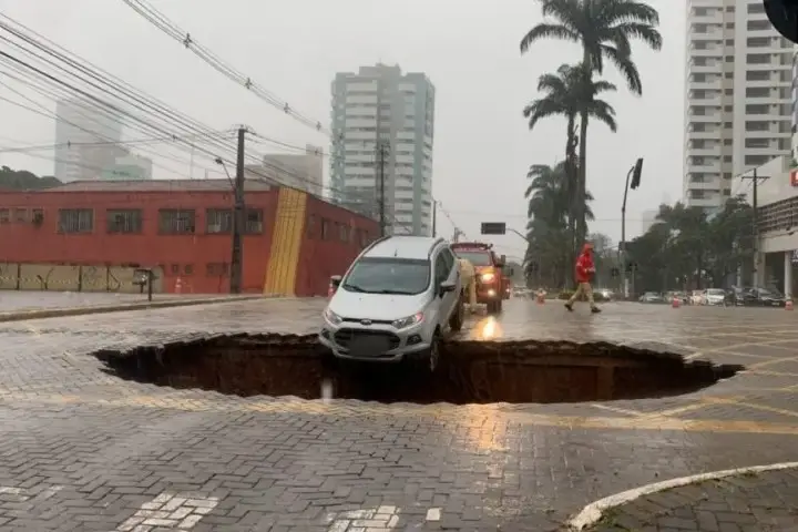 Um vídeo feito no local ilustra bem o fato impressionante. Nas imagens, é possível ver o automóvel ‘pendurado’, com as duas rodas frontais dentro da cratera, que foi aumentando com o passar dos minutos.