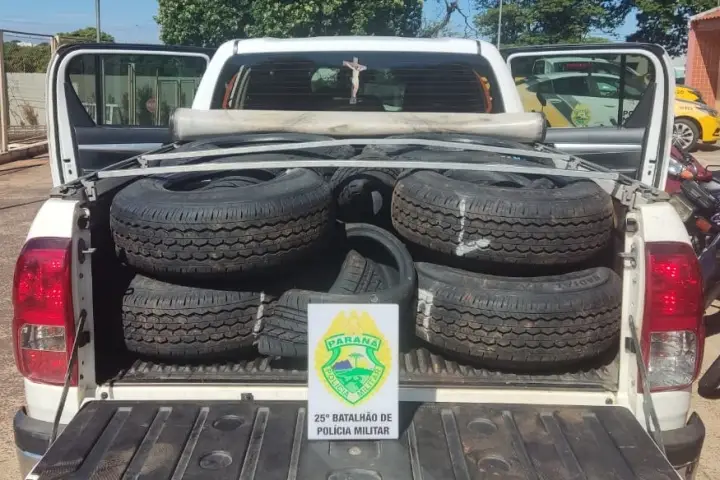 De acordo com a Polícia Militar, o veículo, uma Toyota Hilux, foi abordada depois de uma denúncia anônima. Os pneus haviam sido carregados em uma residência no Jardim Estância.