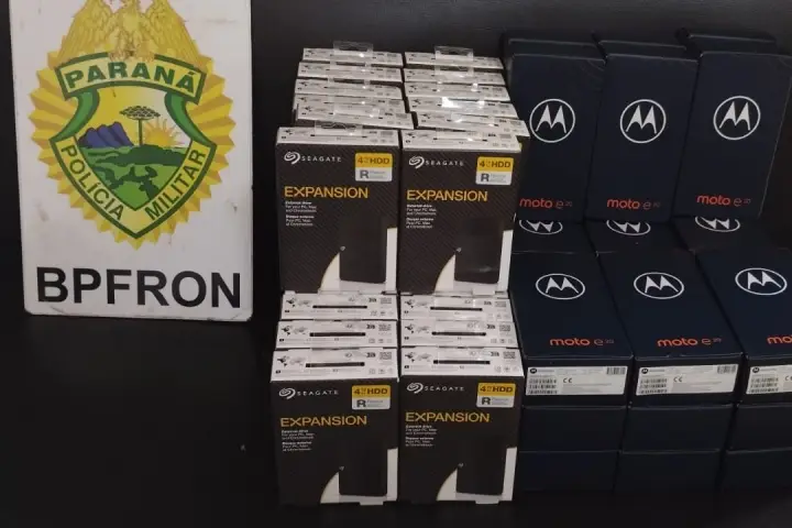 Policiais do BPFron (Batalhão de Polícia de Fronteira) apreenderam nesta terça-feira (25), 24 aparelhos celulares e 30 HDs Seagate durante uma abordagem a um ônibus que fazia a linha Cascavel x Brasília.