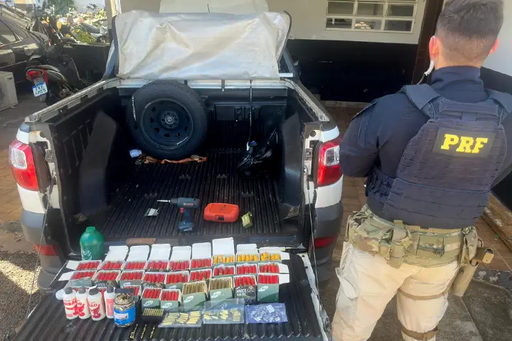 A Policia Rodoviária Federal apreendeu nesta quinta-feira (27) uma Fiat Strada transportando munições ocultas na lataria do veículo. Além de quase 1000 cartuchos utilizados em espingardas, também foram apreendidos insumos para a fabricação de munição de revólveres e pistolas.