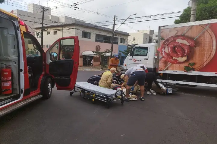 Um acidente entre uma motocicleta Honda Biz e um caminhão Baú no cruzamento da Avenida Maringá com a Rua Honório Ramos, deixou uma mulher de 47 anos ferida na tarde desta segunda-feira (8), em Umuarama .