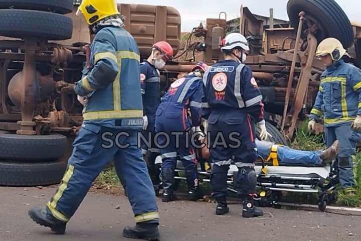 Caminhão tomba na PR-467 em Cianorte e motorista é socorrido pelo helicóptero do Samu