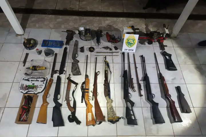 Por meio do serviço de inteligência, a Polícia Militar identificou o suspeito e foi até a residência, mas ele não estava no local. A esposa do suspeito confirmou que havia diversas armas na casa, sendo apreendidas armas de pressão desmontadas e preparadas para comportar cartuchos calibre .22, além de espingardas calibre .22, carabina calibre .22, espingardas de ar comprimido, um revólver, uma garrucha calibre .32, e uma arma calibre .22 desmontada.