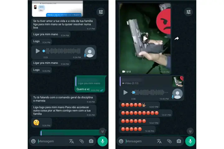 De acordo com ele, depois disso, o golpista, que usava DD 44, teria começado a enviar ameaças de morte com vídeos de armas. “Eu não respondi mais, ele me bloqueou e me colocou em um grupo da facção dele. Mas no grupo ninguém fala nada no assunto, por isso, fiquei com um pé-atrás”, contou.