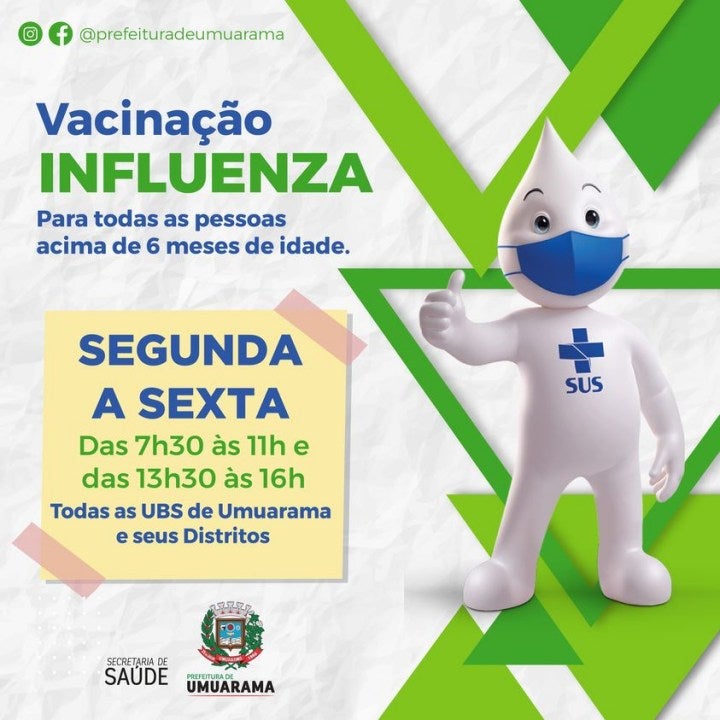 A Secretaria de Saúde de Umuarama divulgou o cronograma de vacinação contra Influenza que acontece nesta quinta-feira (18). Serão imunizadas todas as pessoas acima de 6 meses, confira abaixo: