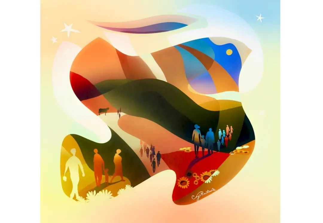 Tendo como inspiração o pensamento do Bispo, o artista explicou os detalhes da sua arte. “A composição tem como elemento focal essa direcionalidade para frente, tudo está conectado para algo que está para frente, como se fosse uma força vetorial para o foco, este foco corresponde ao sol. Na parte mais alta, à direita, tem um caminho formado pelas pessoas da Diocese que estão indo rumo ao sol e que passam por vários desníveis”, detalha.