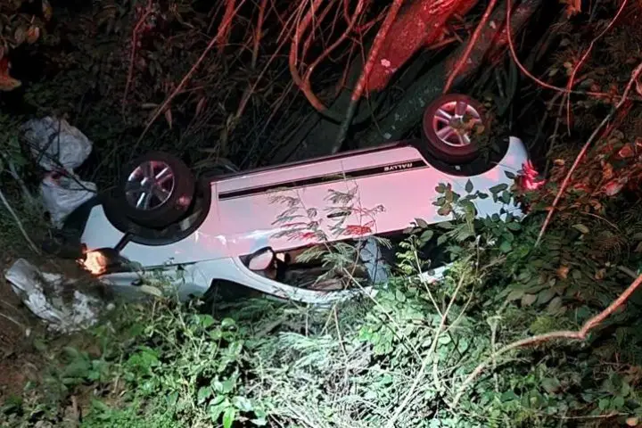 Ao desviar, o condutor perdeu o controle do Gol e saiu completamente da pista, capotando e parando o carro com as quatro rodas para cima em uma região de mata às margens da rodovia.