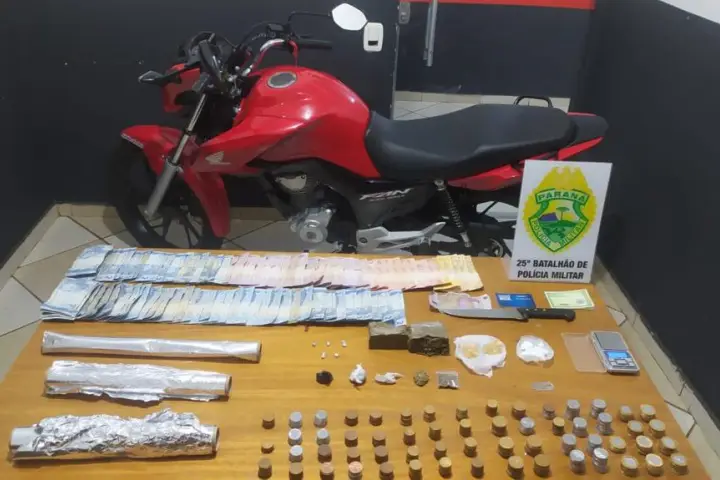 Ao fim, a motocicleta, o dinheiro, os objetos e a droga foram encaminhados para a Delegacia de Polícia Civil de Umuarama.