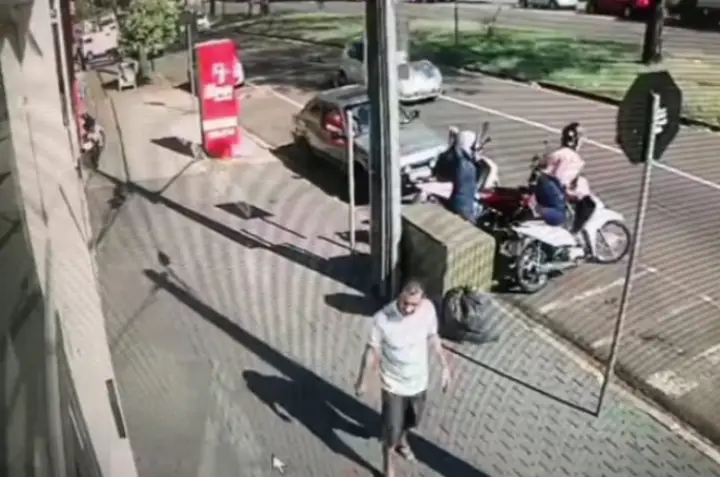 Nas imagens é possível ver que duas moças se aproximam de uma moto e o homem sai do carro em que estava. As mulheres saem com a moto e, na sequência, um homem retorna, abre o compartimento que fica embaixo do banco da moto e pega o capacete que estava guardado. Por fim, o homem entra no carro e vai embora.