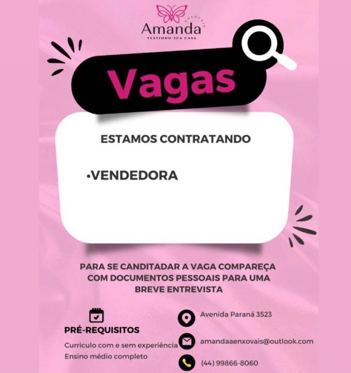 A empresa de Umuarama Amanda Enxovais também divulgou que está com uma vaga aberta para a função de vendedora. Dentre os requisitos, é exigido que a candidata possua Ensino Médio completo.