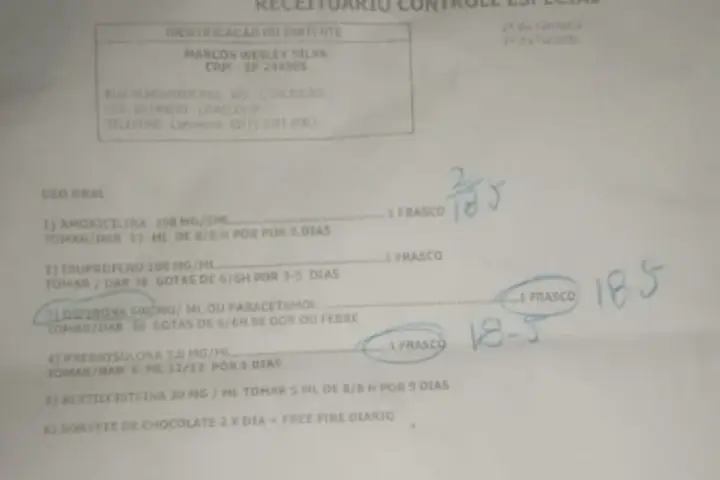 Além de “sorvete de chocolate 2x por dia” e “Free Fire Diário”, o médico também prescreveu amoxicilina, ibuprofeno, dipirona, prednisolona e acetilcisteína.