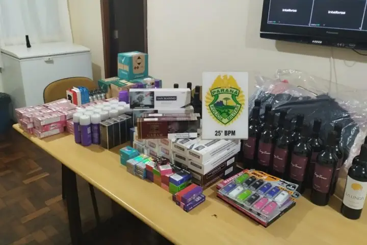 Em verificação, os policiais encontraram 240 carteiras de cigarro Eight; 120 carteiras de cigarro San Marino; 20 carteiras de cigarro Gudan Garang; 13 cigarros eletronicos Nikbar; 6 cigarros eletronicos Ignite; 6 cigarros eletrônicos de outras marcas; 4 linhas de pescar Vexter; 60 desodorantes Rexona; 4 fones sem fio Redmi; 48 Limas K&F; 22 cremes Ausie; 2 estojos de maquiagem; 13 perfumes importados; 1 jaqueta; 12 vinhos Luigi Bosc; 29 caixas de Trident; e 24 isqueiros Bic.