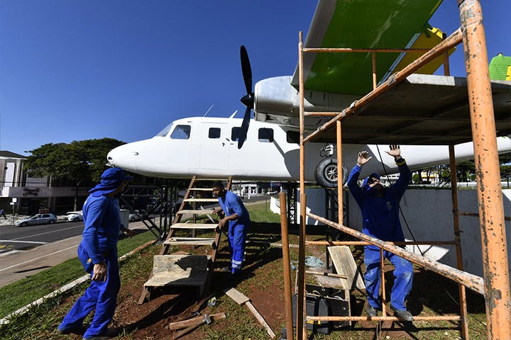 Equipes das secretarias de Obras e de Serviços Públicos da Prefeitura de Umuarama estão trabalhando nos detalhes finais da implantação da aeronave modelo Twin Commander 680FL na Praça Santos Dumont.