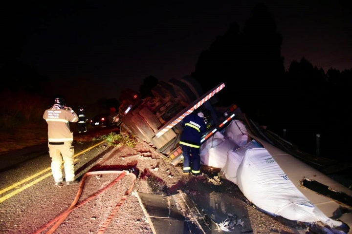 O tombamento aconteceu no sentido Umuarama a Xambrê e a pista da rodovia está parcialmente interditada. Os veículos estão passando pela lateral da pista.