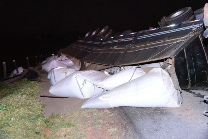 Parte da carga ficou espalhada e a remoção pode demorar. Fica o alerta para que os motoristas que forem trafegar pelo trecho tenham atenção.