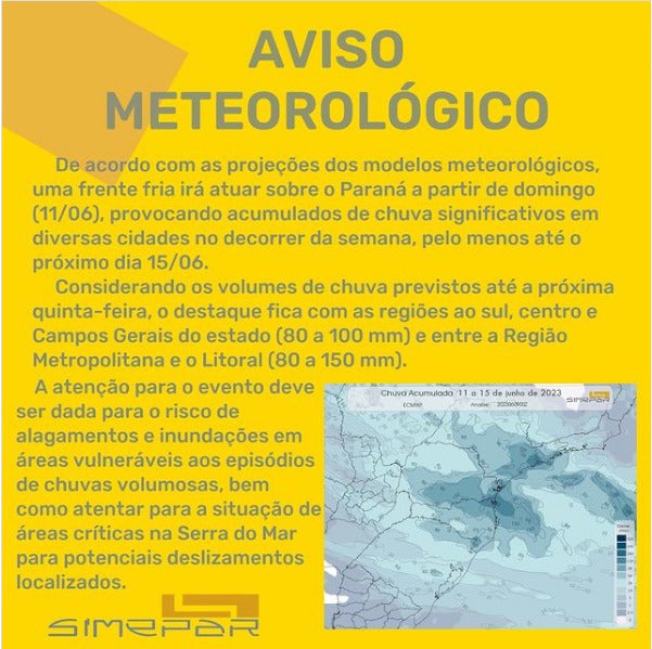 “Chuvas são previstas sobre diversas regiões paranaenses no domingo, com o avanço de uma frente fria sobre o estado. Há risco para alguns temporais no interior do Paraná. Como esse sistema frontal avança lentamente sobre o estado, a instabilidade se mantém também no início da semana. Volumes de chuva significativos devem ser registrados durante esse período”, alerta a Simepar.