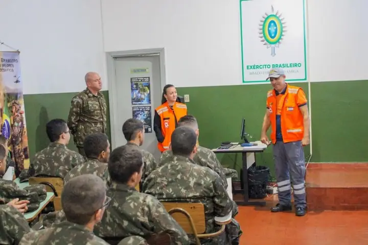 Integrantes da Coordenadoria Municipal de Defesa Civil de Umuarama realizam uma palestra para os 150 atiradores do Tiro de Guerra 05.012 na última quarta-feira, 7, por volta das 5h30 – horário de instrução dos jovens que prestam o serviço militar obrigatório na unidade. O coordenador, inspetor Enivaldo Ribeiro, membro da Guarda Municipal desde 1992, explicou o que é a defesa civil, como e quando ela é acionada para atuar e a colaboração que recebe das forças armadas, se necessário, como determina a Constituição Federal.