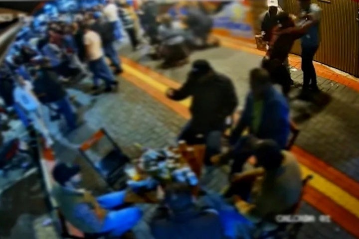 Nas imagens é possível ver o momento que a vítima é levada para um local mais afastado por dois homens. Em determinado ponto da conversa, um dos suspeitos empurra a vítima contra a parede e o outro golpeia o rapaz repetidas vezes com a faca que estava escondida no moletom.