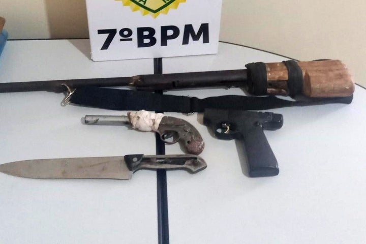 Com as informações, os policiais iniciaram um patrulhamento pela região, onde o autor foi encontrado e abordado, porém não estava em posse de nada ilícito. Já na residência de um parente – que autorizou a busca domiciliar – os policiais encontraram uma espingarda caseira tipo garrucha; uma coronha e simulacro de pistola na cor preta; e uma faca de 23 centímetros, que possivelmente seriam do autor.