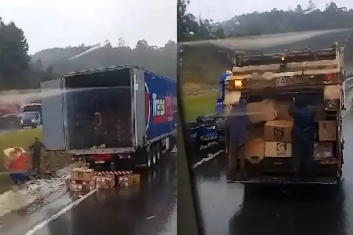 As imagens foram feitas por um motorista que passava pelo trecho pouco após o acidente. No vídeo, é possível ver algumas pessoas carregando caixas do caminhão caídas do veículo de grande porte para dentro do que, ao que parece ser, um caminhão de lixo.