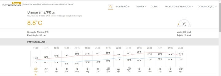 A mínima prevista pelo instituto para esta quarta-feira em Umuarama era de 11°C, porém até o fechamento desta matéria os termômetros se mantinham abaixo dos 10°C. O Simepar também prevê uma máxima de 13°C, que deve ser atingida por volta das 15h.