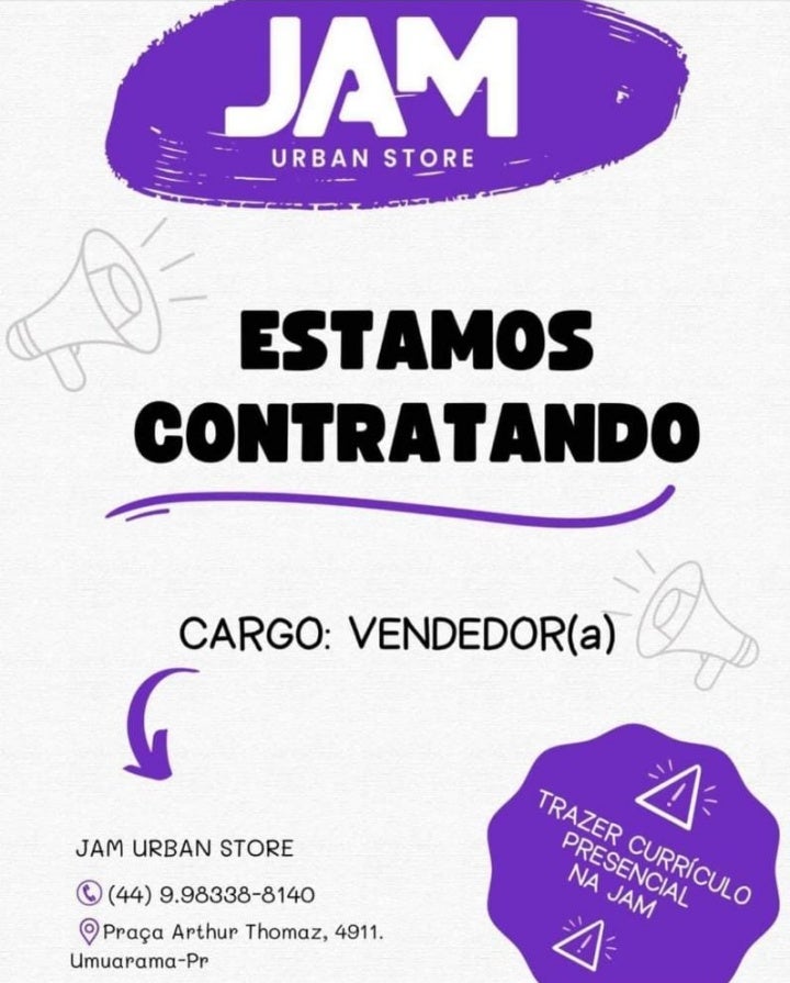 A loja Jam Urban Store também divulgou, através de suas redes sociais, que está com uma vaga disponível para o cargo de vendedor, em Umuarama.