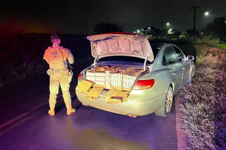 Foram realizadas buscas a fim de encontrar o condutor, todavia não foi possível localizá-lo. Ao verificar o interior do carro, foi constatado que este estava completamente carregado, somente com espaço para o motorista, com cigarros contrabandeados do Paraguai.
